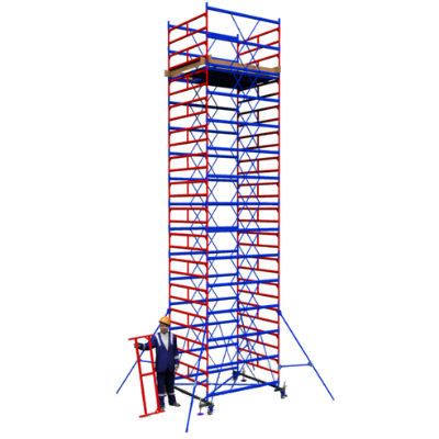 Вышка снабжена обрезиненными колесами и винтовыми опорами, что значительно облегчает её транспортировку к месту эксплуатации или перемещение вдоль обрабатываемой поверхности.